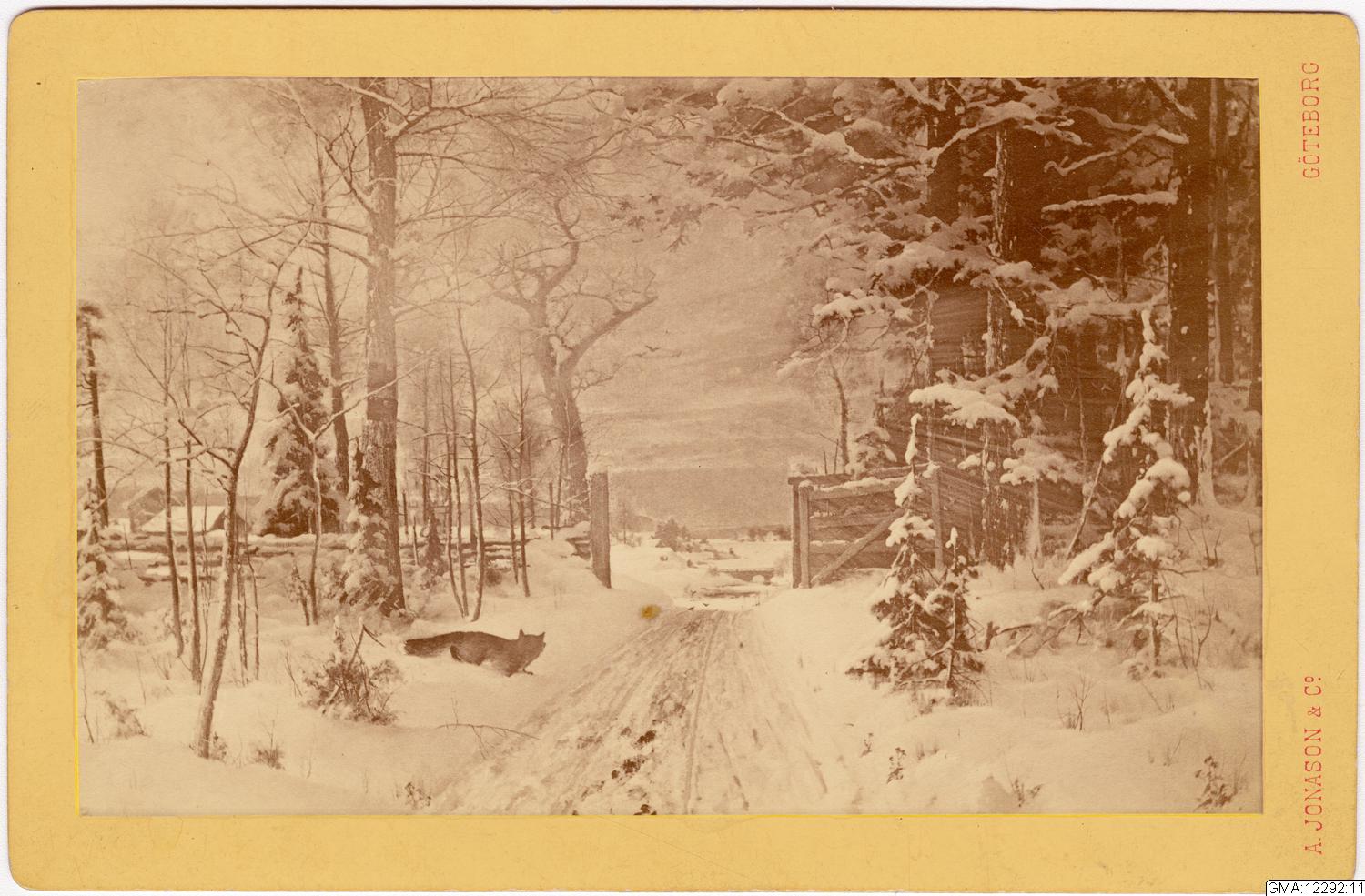 Bilden monterad på gul kartong, med stämplat i rött A. Jonason & Co Göteborg, på både fram och baksida. På baksidan även klisterlapp; Från Konstutställningen i Göteborg 1881. A. M.Lindström. 334 Vinterlandsakp