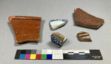 • Glaserat rödgods, fragment, Ostindiskt porslin, fragment, Fajans, fragment. Den stora rödgodsskärvan hör troligtvis samman med GSMS:130037:3043.