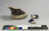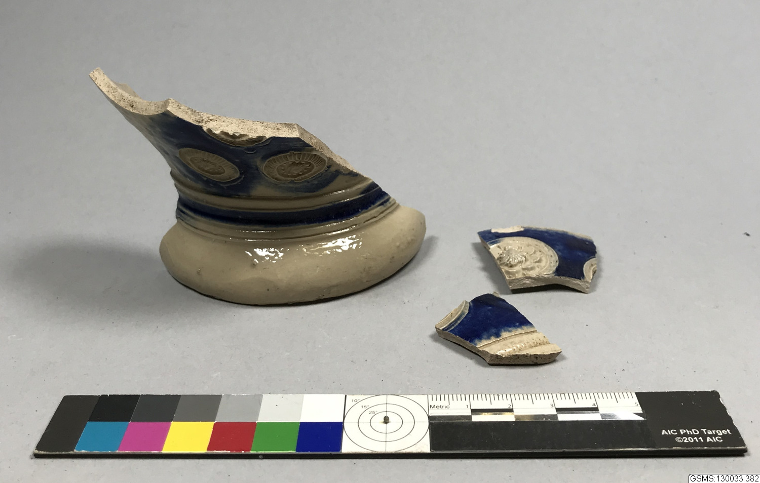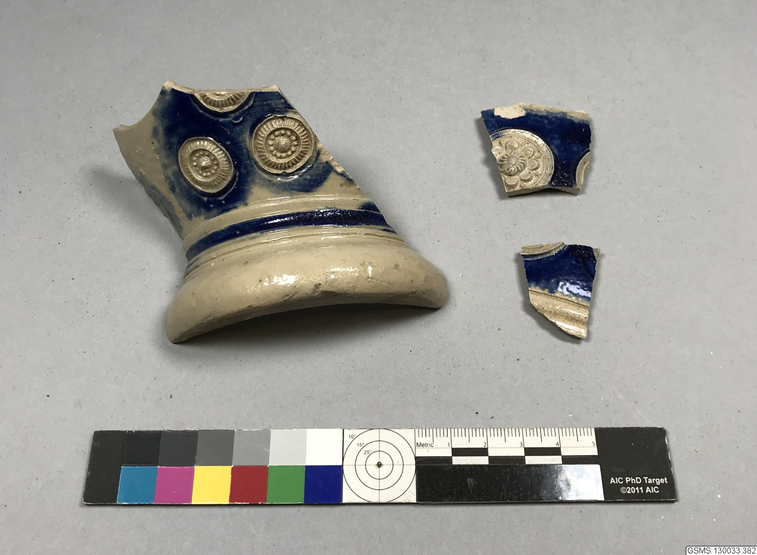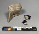 • Gråblått stengods, fragment med plastiska detaljer, Blåvit fajans, fragment