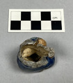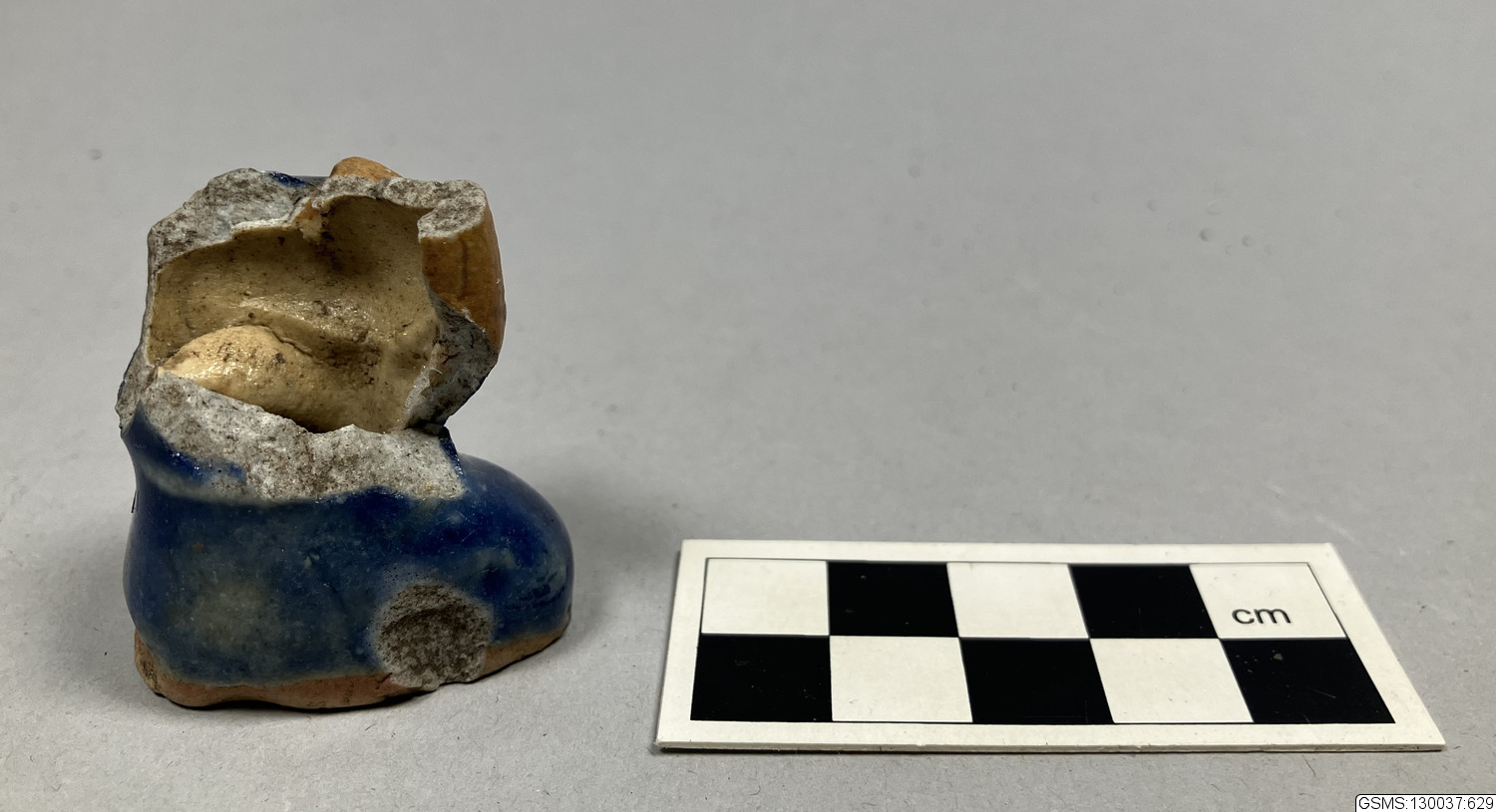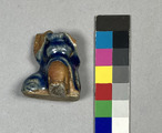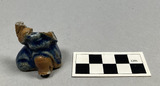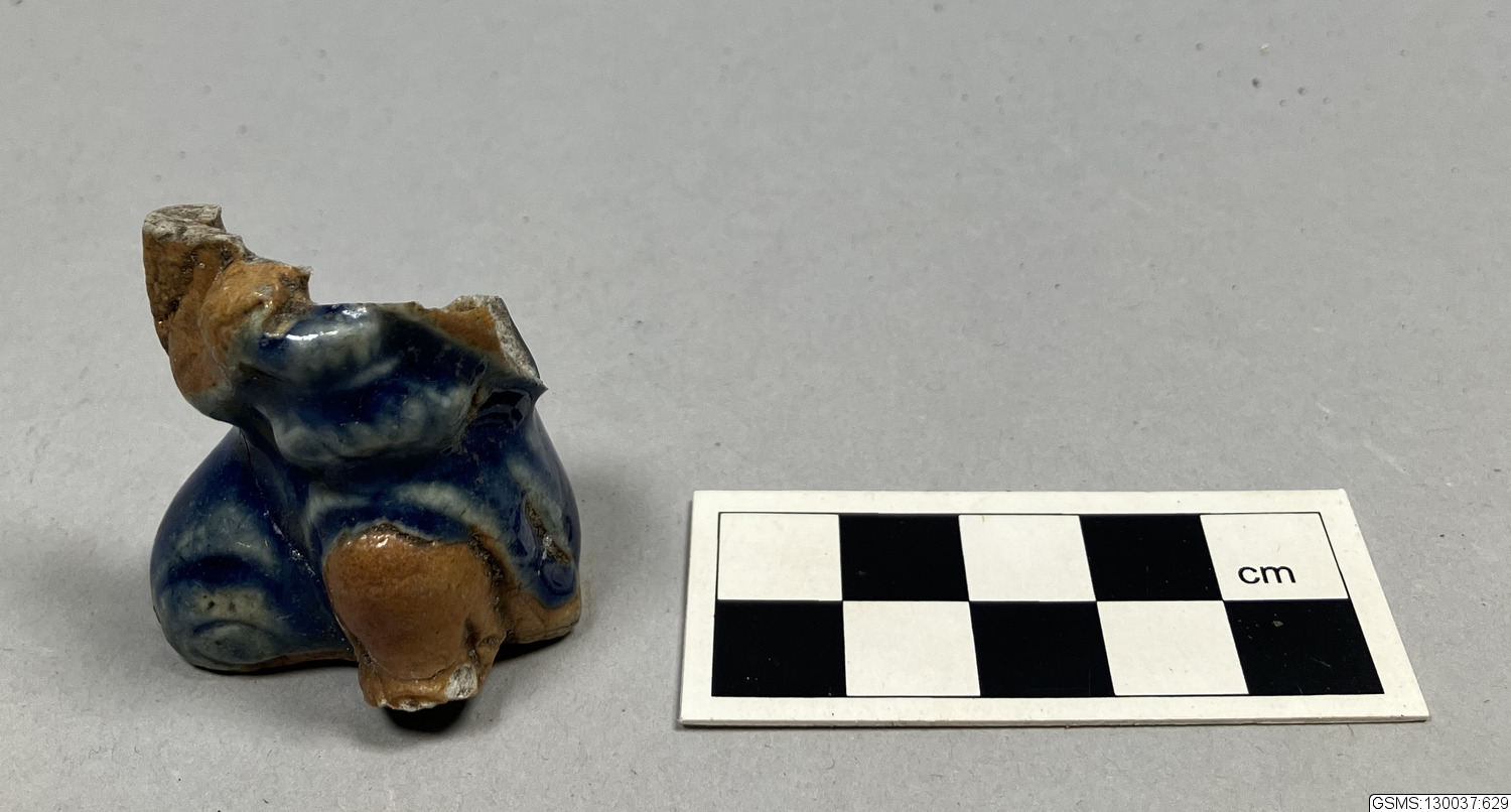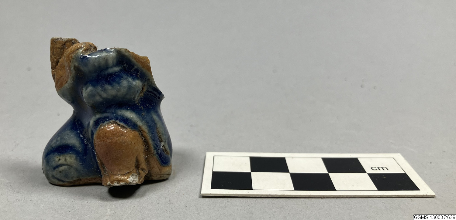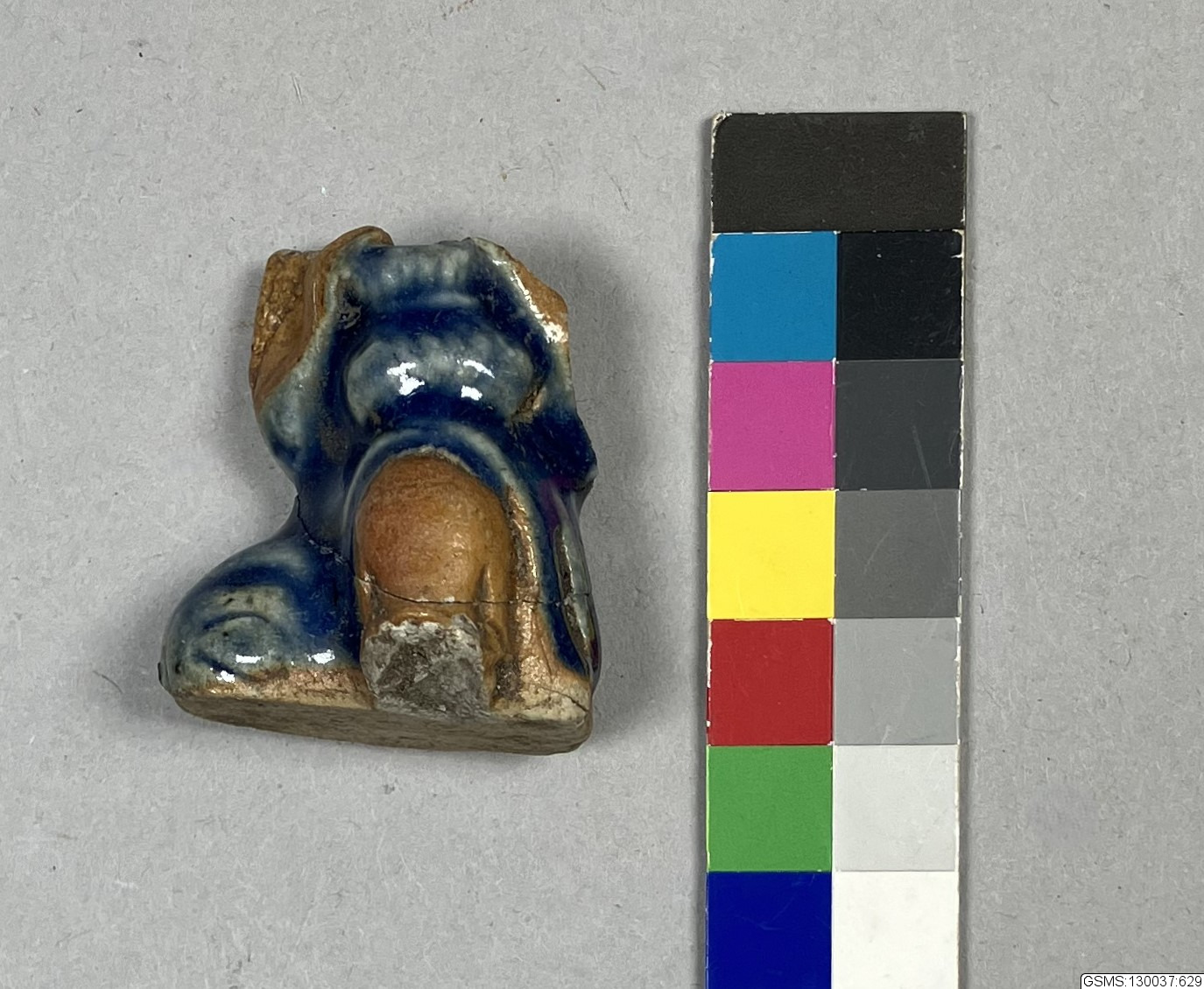 • Polykrom fajansfigur, fragment. Sittande figur med vattenkrus i knät (?)