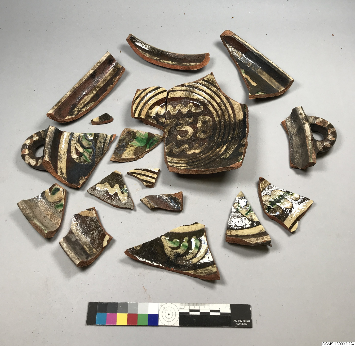 • vid skål med piplerdekor och årtal i mitten, 1738