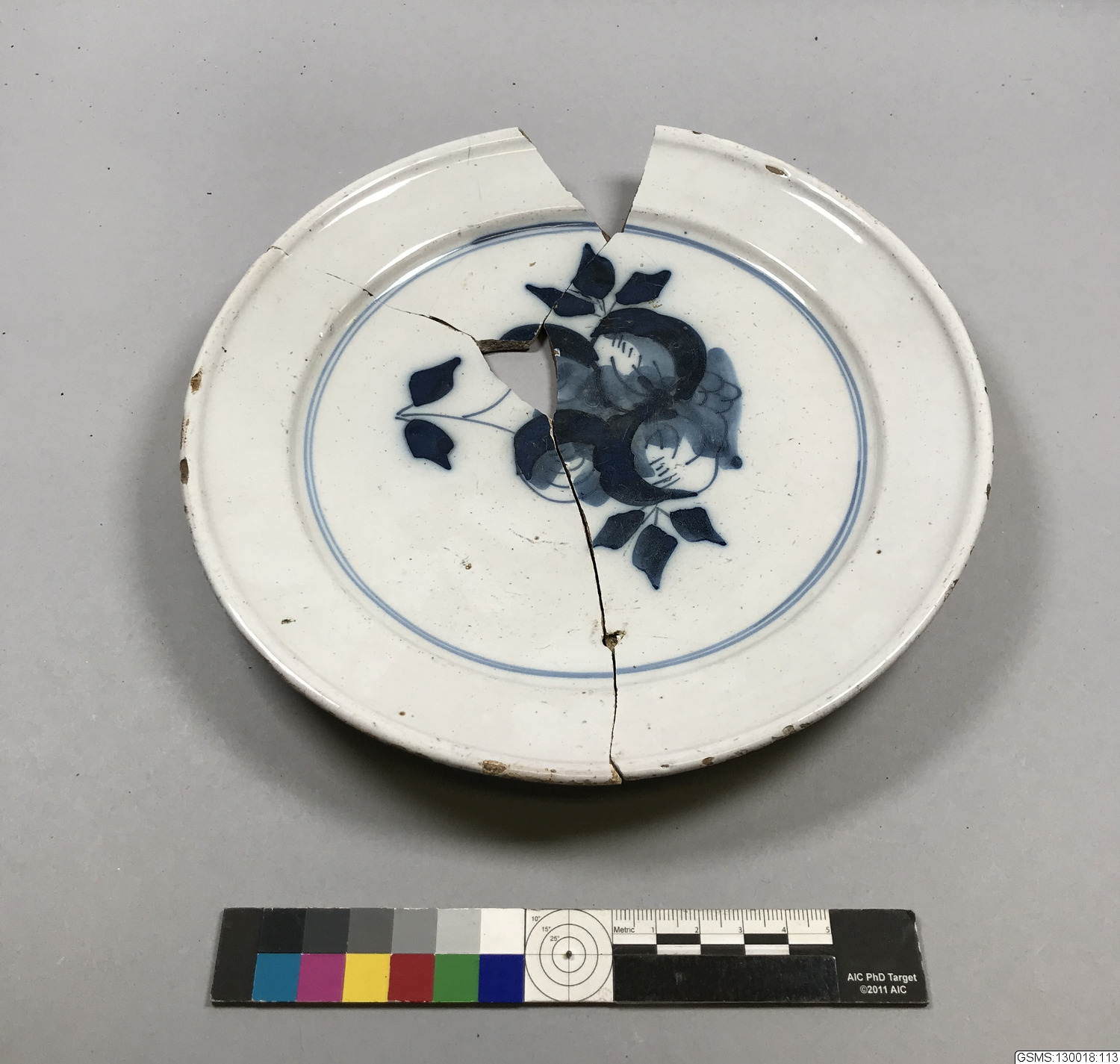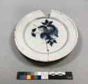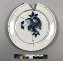 • Blåvitt fajansfat med stillebensmotiv, fragment