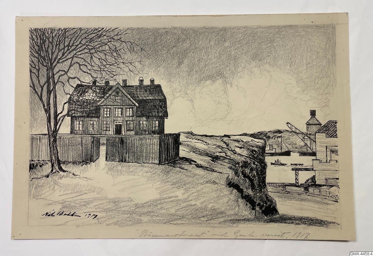 • Båtmanstorpet vid Gamla varvet. Till vänster i bild syns ett hörn av Amerikaskjulet.