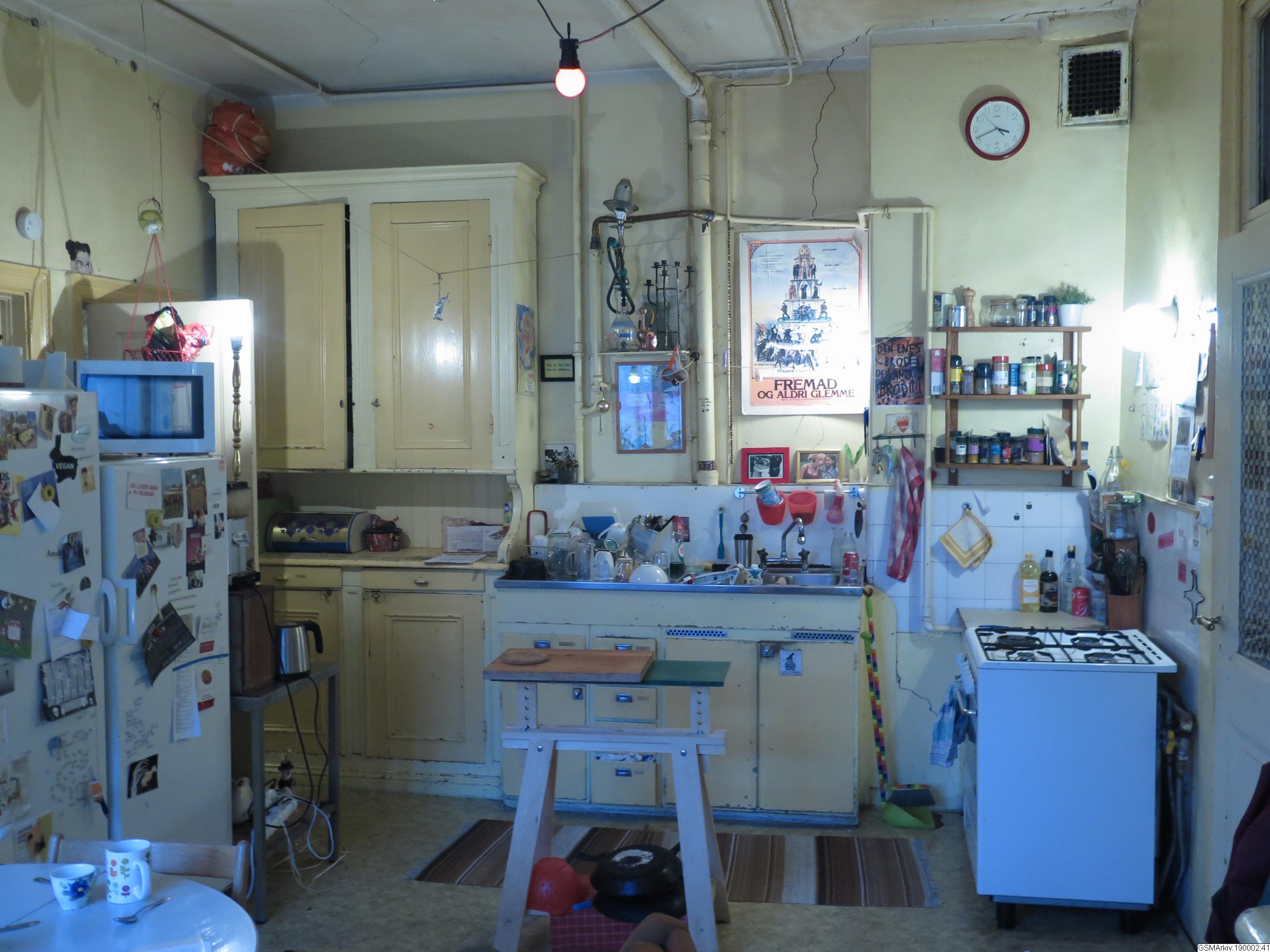 Köket med äldre skåpsinredning, gasspis och kylskåp och ev.frys. Kollektivet var beläget i en sekelskifteslägenhet med mycket originaldetaljer som inte renoverats mycket under 1900-talet. Samtidsdoku...