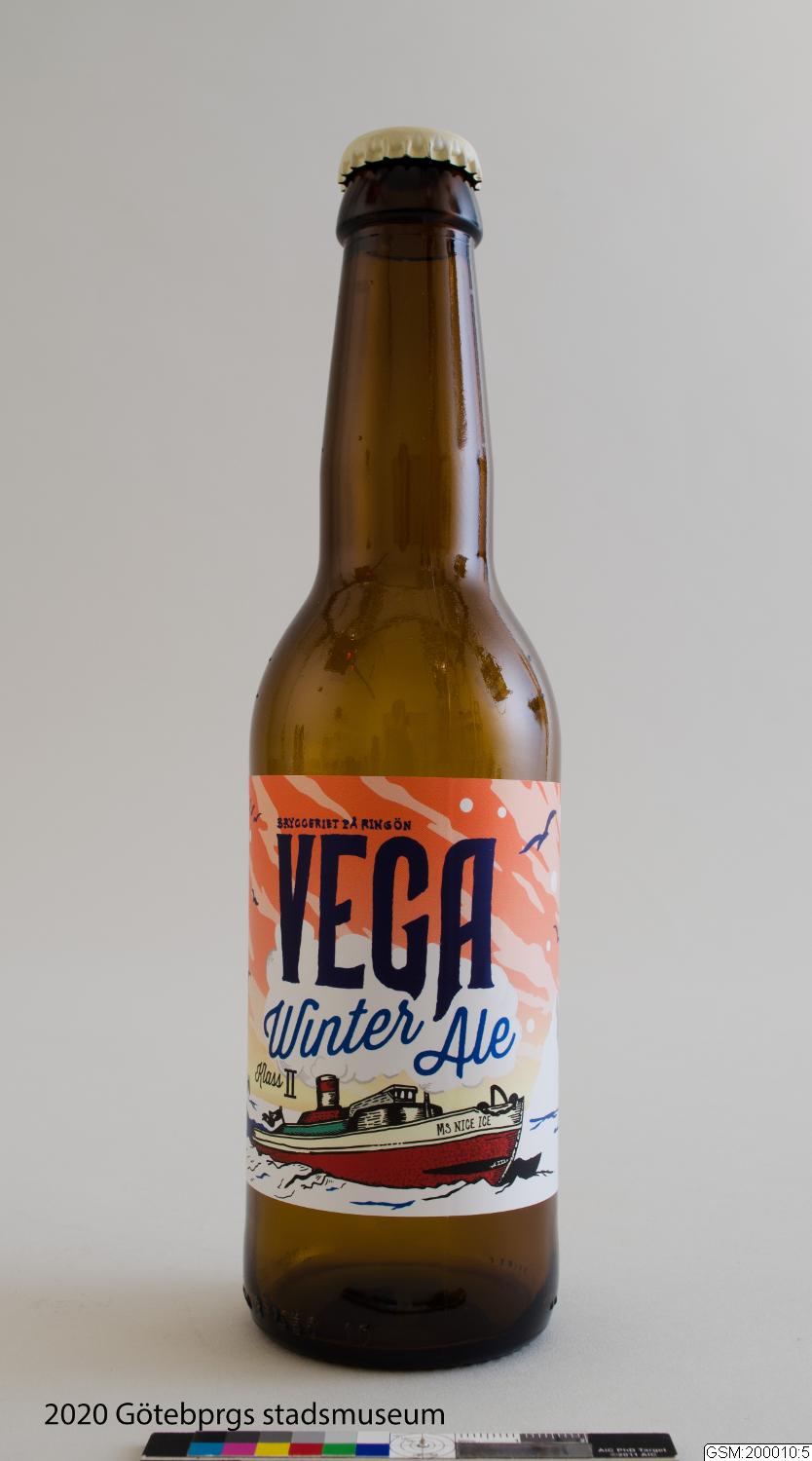 • ölflaska av brunt glas med metallkapsyl från Vega bryggeri