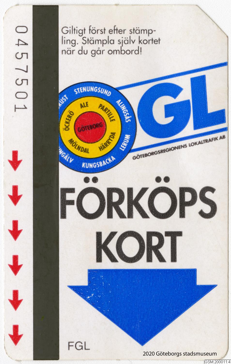 • Magnetkort från Göteborgsregionens lokaltrafik. Användes som betalningsmedel under 1990-talet på spårvagnar och bussar.