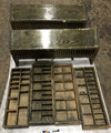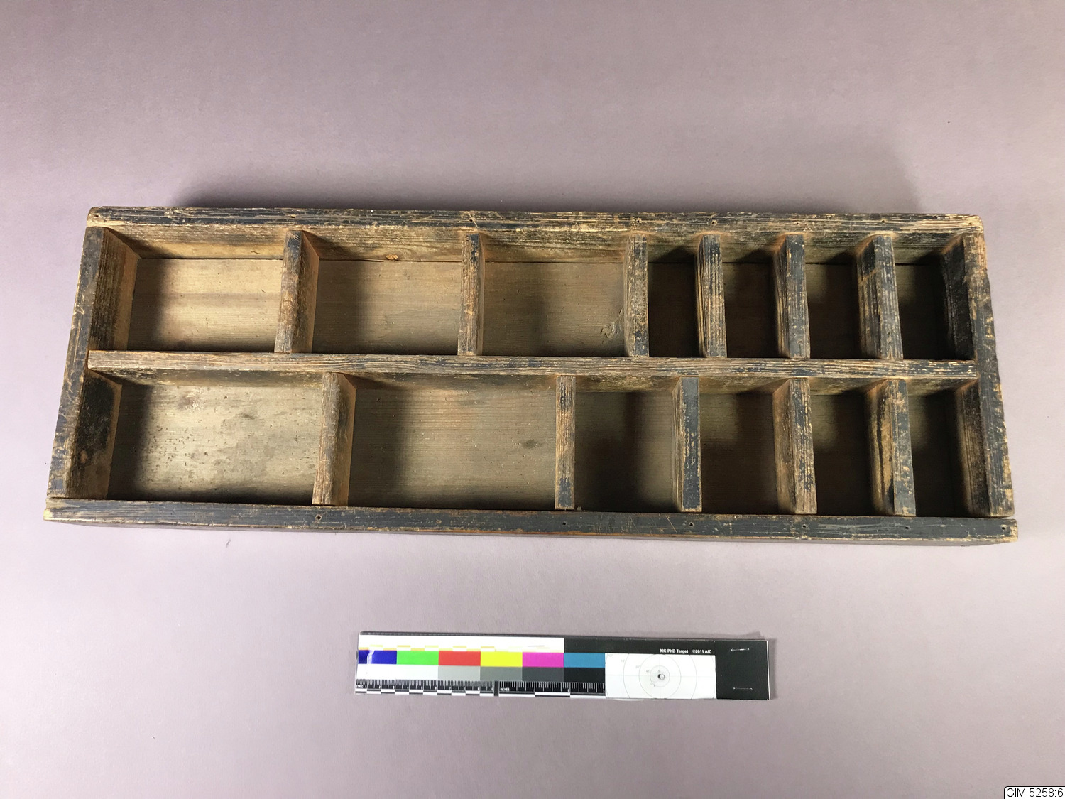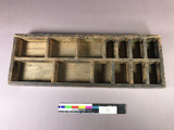 Låda i trä, ihopsatt med skruvar, med 13 fack av olika storlek, från 9x 17 cm till 9 x 4 cm. Träet har mörknat och blivit smutsigt på grund av användning.