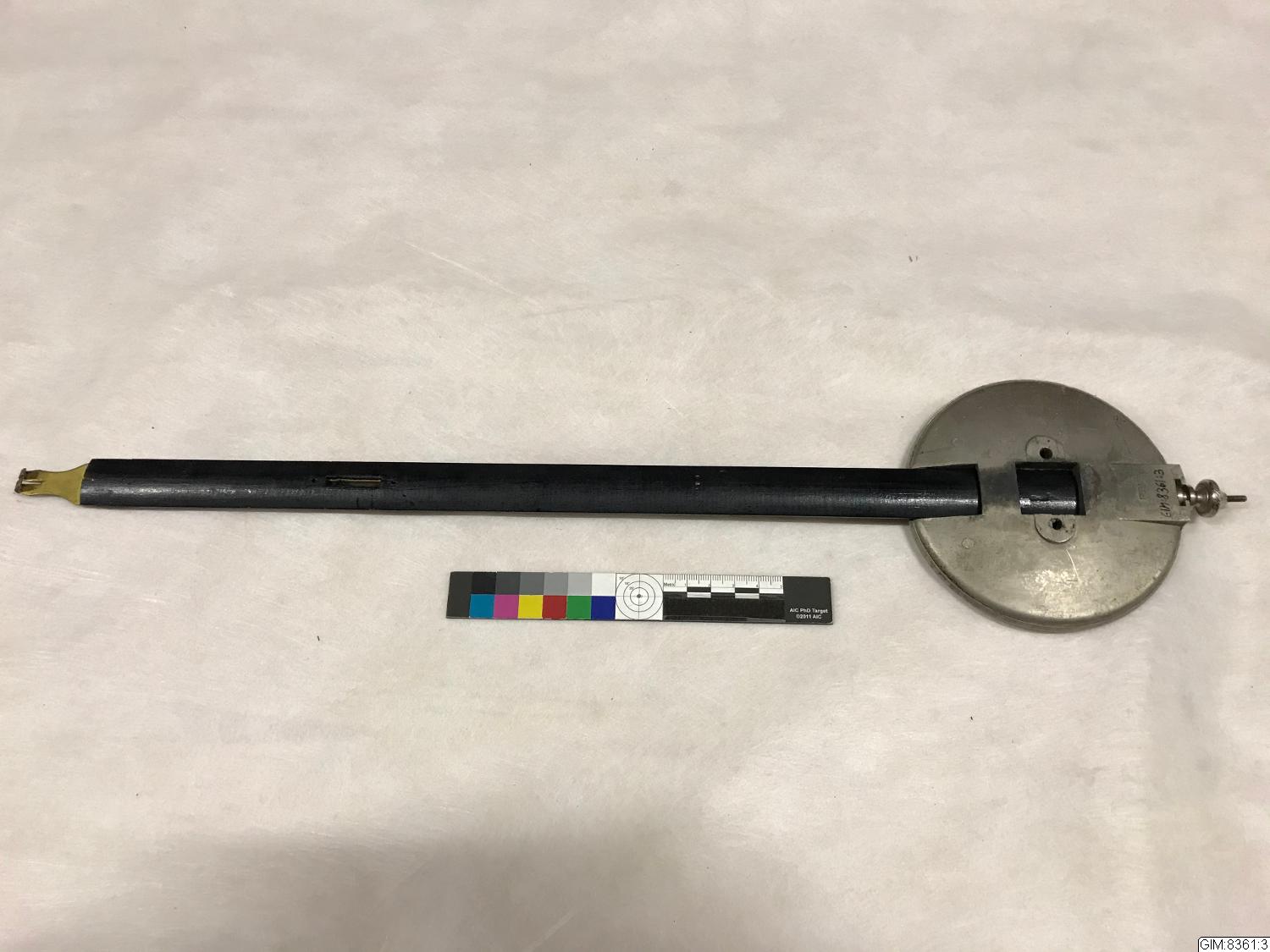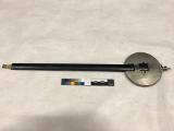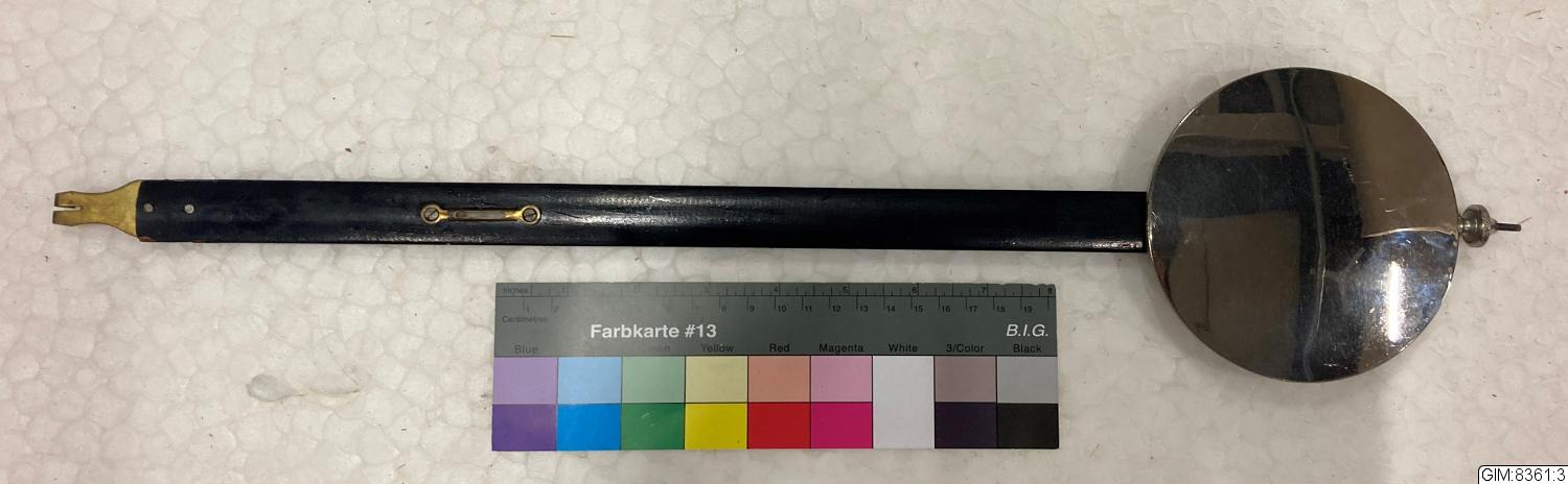 • Pendelstången plattad, svart, metall. Den platta runda vikten nedtill är blankt, av rostfritt stål, baksidan är matt,