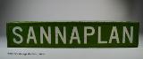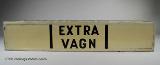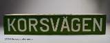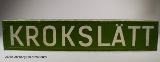 Takskylt för spårvagn fram och bak, gröna linjen. Fyrsidig, grön med vit versal text på tre sidor: "Korsvägen", "Sannaplan", "Krokslätt" samt en sida vit med svart text "Extra vagn"