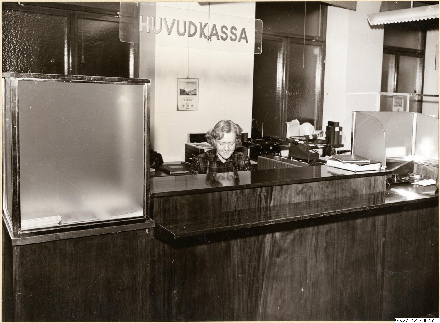 • Ocean Försäkrings AB, kassan med Fru Margareta Klemens bakom disken..