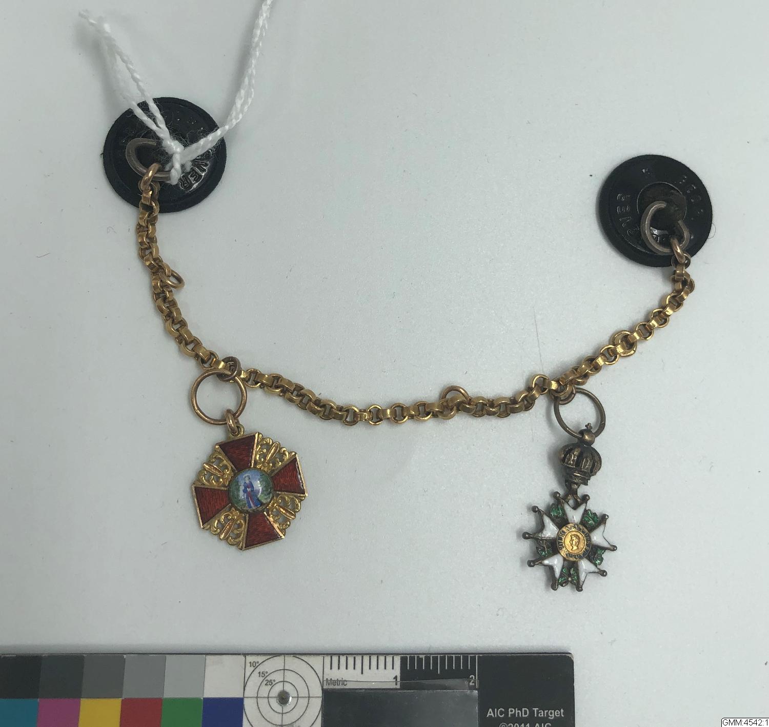 • miniatyrkedja med S:t Annaorden samt kejserliga franska Hederslegionens riddartecken, (infattat i silver), innehavaren Ekman innehade officerstecknet, som är helt av guld, oklart varför en miniatyr av en lägre värdighet finns med bland dennes miniatyrer./ctn.