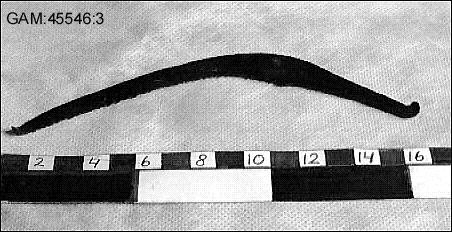 Skära av järn, glödpatinerad. Den triangulära tången, som har rektangulär profil, slutar i nedåtböjd spets. Eggen är sågtandad. Skärans yttersta cm är böjd i trubbig vinkel, i samma vinkel som tångens ända. Eggpartiet har i huvudsak triangulär profil,