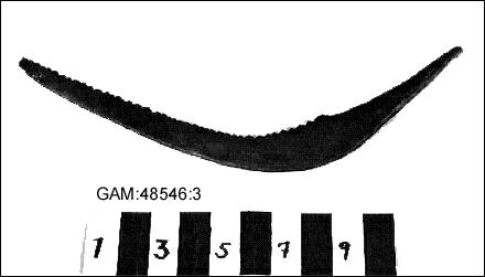 Skära av järn, glödpatinerad. Den triangulära tången, som har rektangulär profil, slutar i nedåtböjd spets. Eggen är sågtandad. Skärans yttersta cm är böjd i trubbig vinkel, i samma vinkel som tångens...