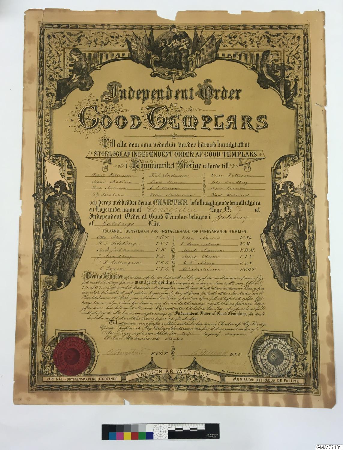 • Charter, 'Independent Order af Good Templars' utfärdad 12 augusti 1889