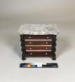 • Byrå i mörkbrunt trä med skiva av marmor och fyra utdragbara lådor.