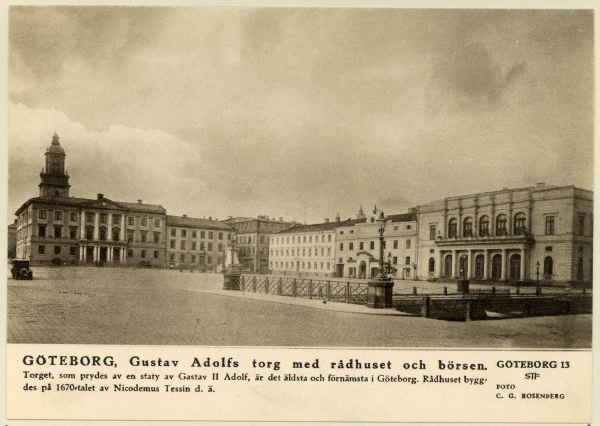 Göteborg, Gustav Adolfs torg med rådhuset och börsen. Göteborg 13 STF. Torget, som pryddes av en staty av Gastav II Adolf, är de äldsta och förnämnsta i Göteborg. Rådhuset byggdes på 1670 talet av Nicodemus Tessin d.ä