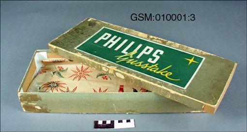 grön-brun spräcklig originalkartong med texten "Philips ljusstake" skrivet på grönt. I kartongen ligger brunt omslagspapper med röda julstjärnor med rosetter runt stjälken samt text "God Jul"