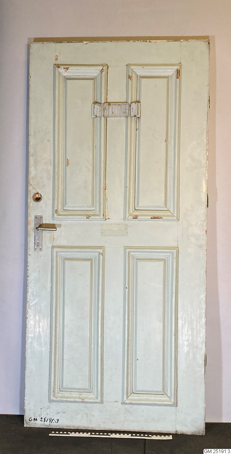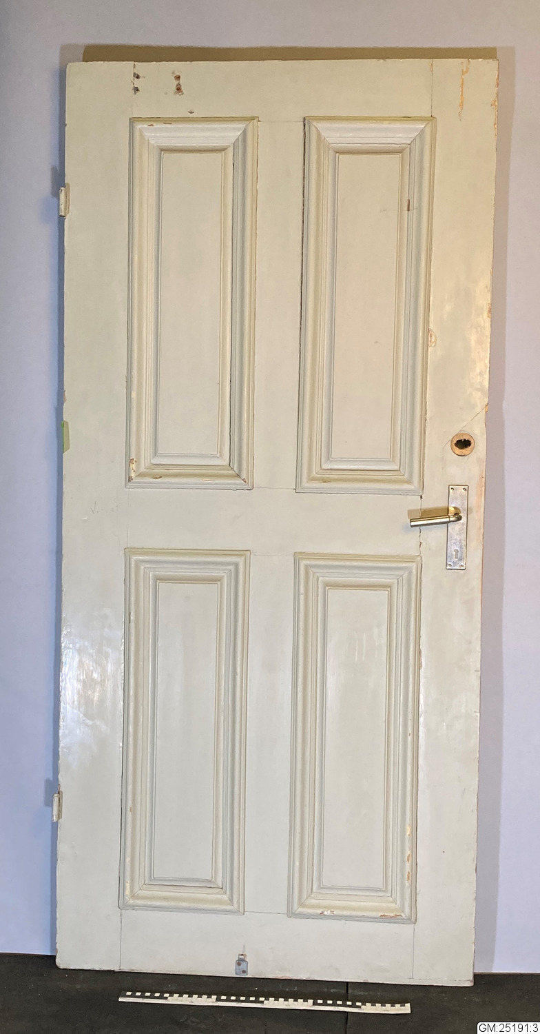 • Gammal spegeldörr, helfransk. Fyra stående jämnstora fyllningar lika kraftiga som ramen.