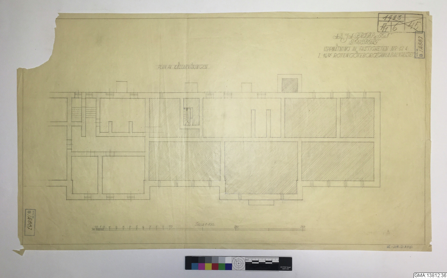 • Ritning av Gamla Barnhuset, Stampgatan 20. Plan av källarvåningen av Folke Bensow.