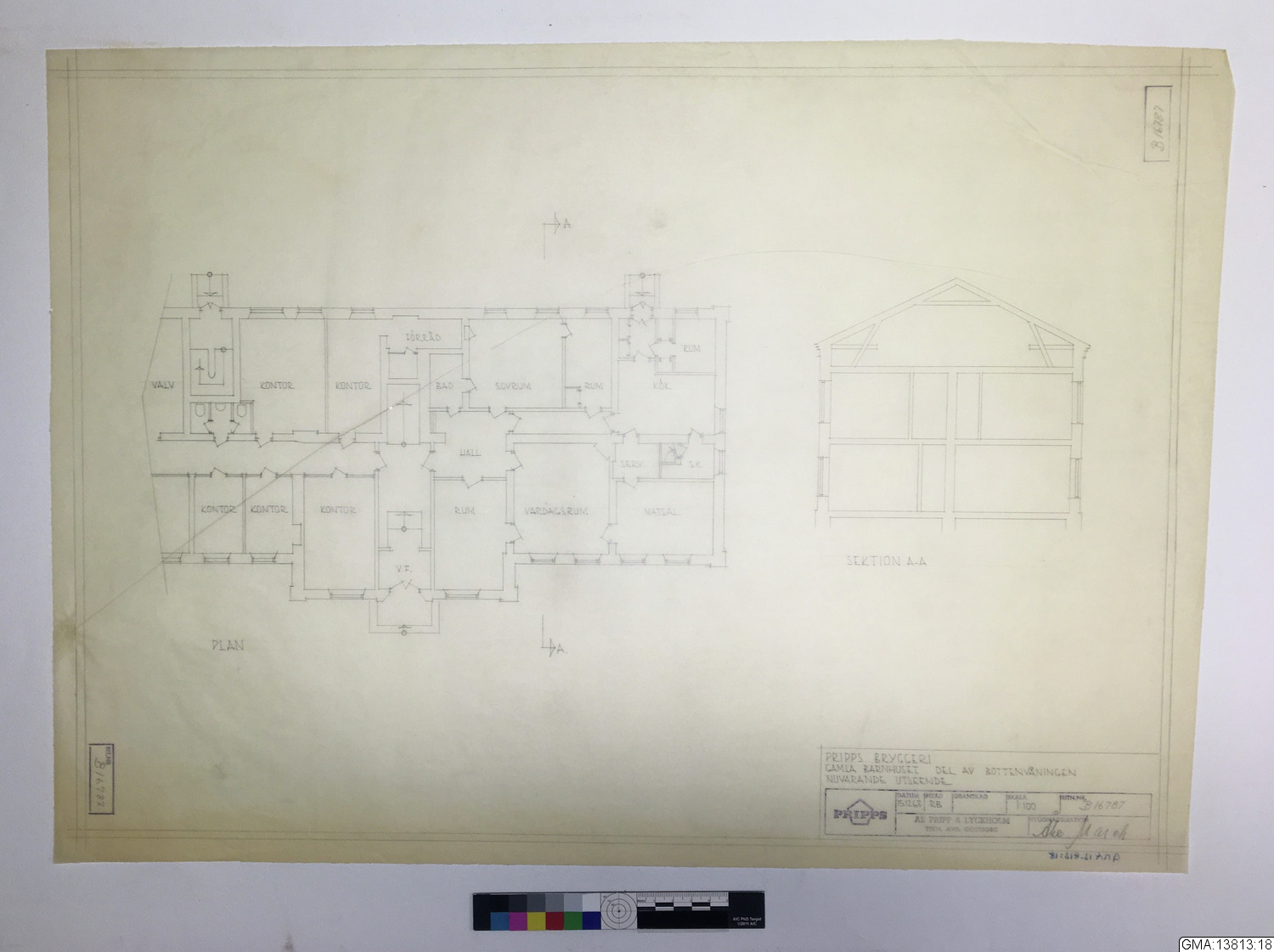 Ritning, uppmätningsritning till del av bottenvåningen, nuvarande utseende. Tomt 12A i 16 Roten (= Stampgatan 20 (18)), Gamla Barnhuset. Utförde av Åke Marek 1943 - 1963.