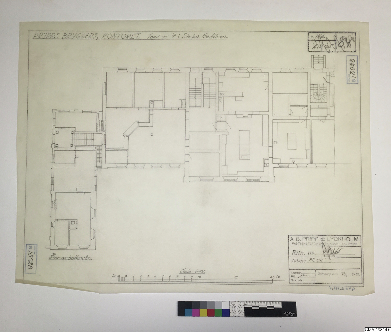 • Ritning till Pripps Bryggeri, kontoret, 1933. Tomt 12A i 16 Roten ( = Stampgatan 20 (18) ).