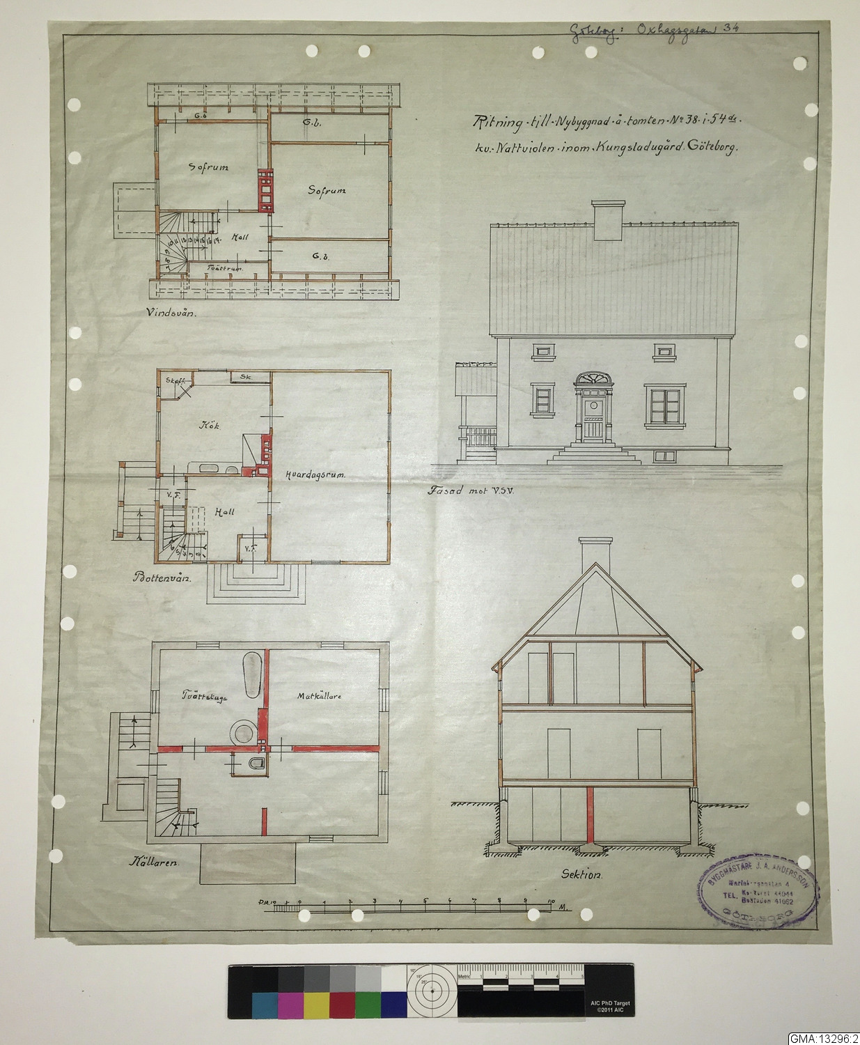 • Ritning på väv till nybyggnad på tomten no 38 i 54 kv. Nattviolen inom kungsladugård, Göteborg (= Oxhagsgatan 34) av byggmästare J A Andersson.