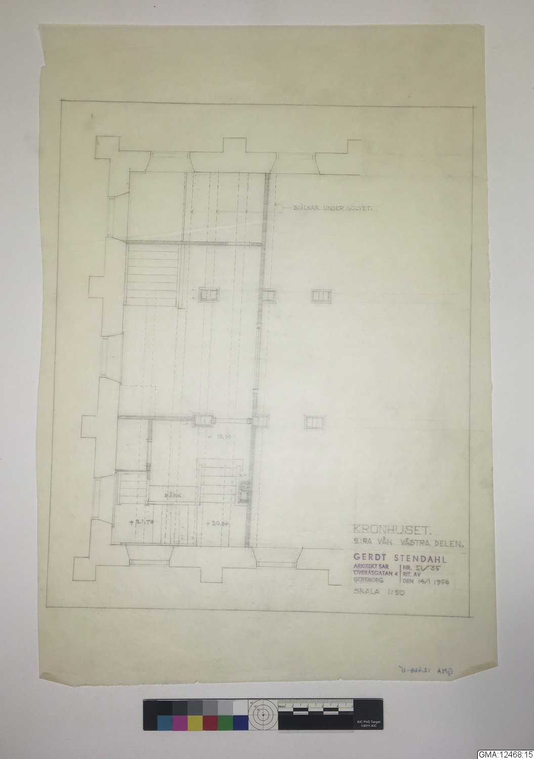 Uppmätningsritning, Ritning till Kronhuset; Planritningar, detaljer: entren i västen, kapprum 2:a vån och entresolvåning i öster (2:a våning) av arkitekt SAR Gerdt Stendahl.