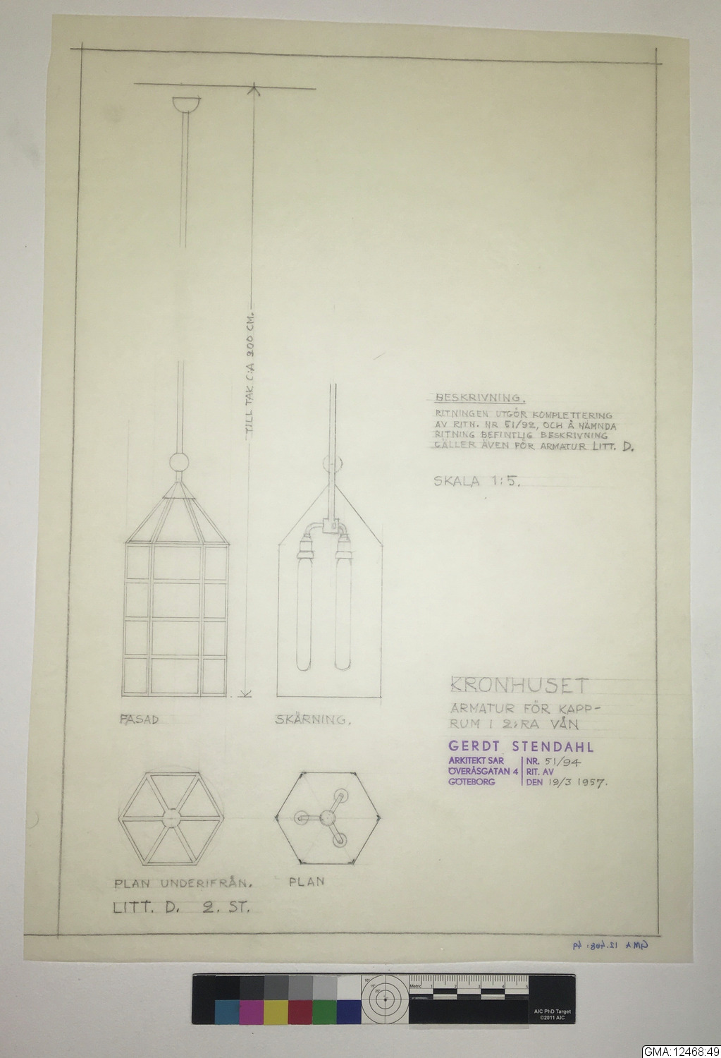 • Uppmätningsritning till Kronhuset; Belysningsritning och detaljer av Arkitekt SAR Gerdt Stendahl, gjorde till den pågående ombyggnader av huset.