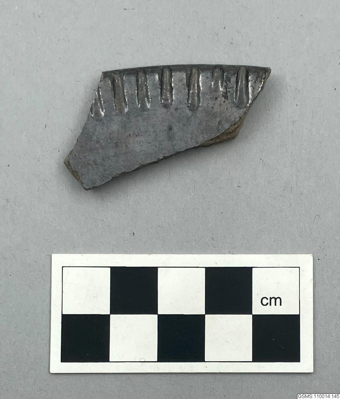 • Svartglaserat gods, kantfragment med intryckningar
