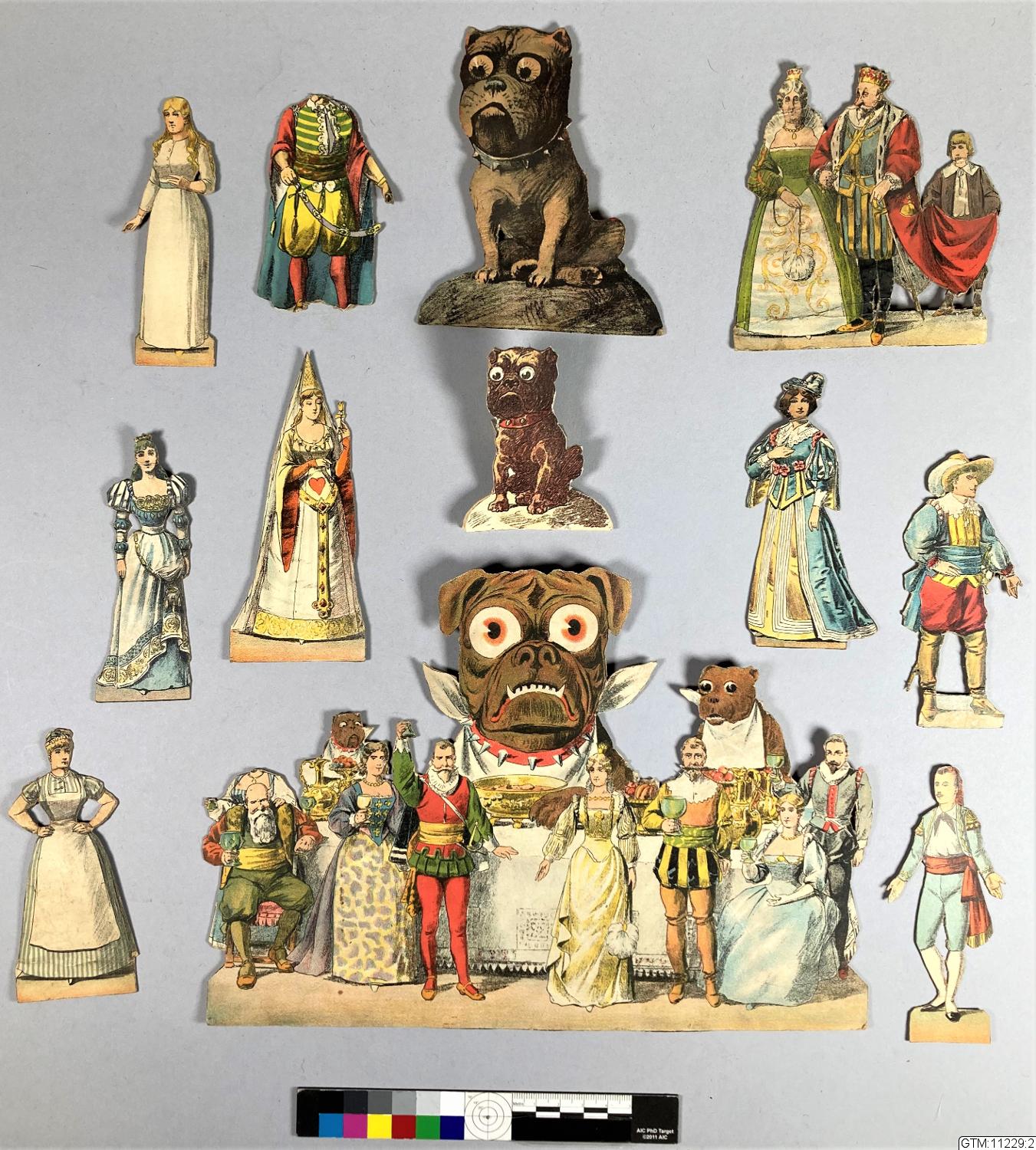 • Figurer utskurna i kartong föreställande en hund med stora ögon samt andra karaktärer i pjäsen Elddonet