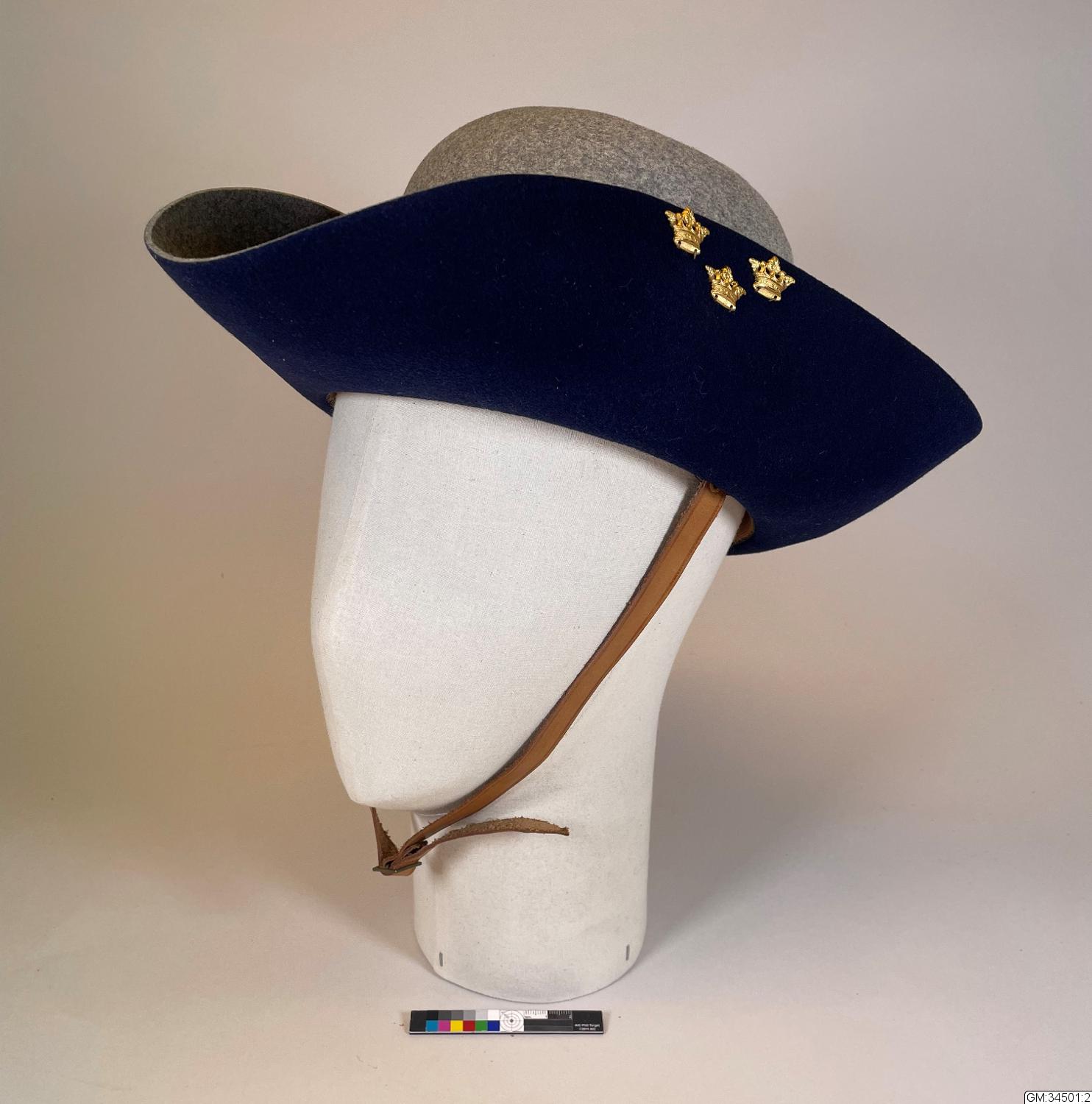 Från lappkort: Trekantig hatt av grå yllefilt med mörkblå filt på det uppvikta brättet. Detta är fäst på tre ställen. På vänster sida emblem tre kronor i mässing. Försedd med läderband att knyta under hakan. Storlek 55.