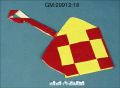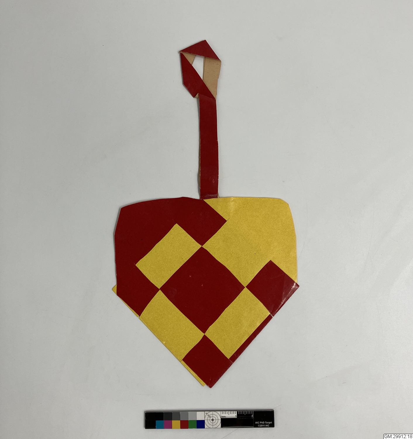 • Hjärtformad korg av flätat papper i gult och rött att hänga i julgranen.