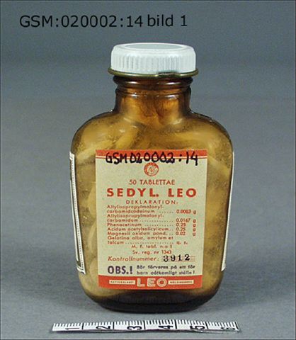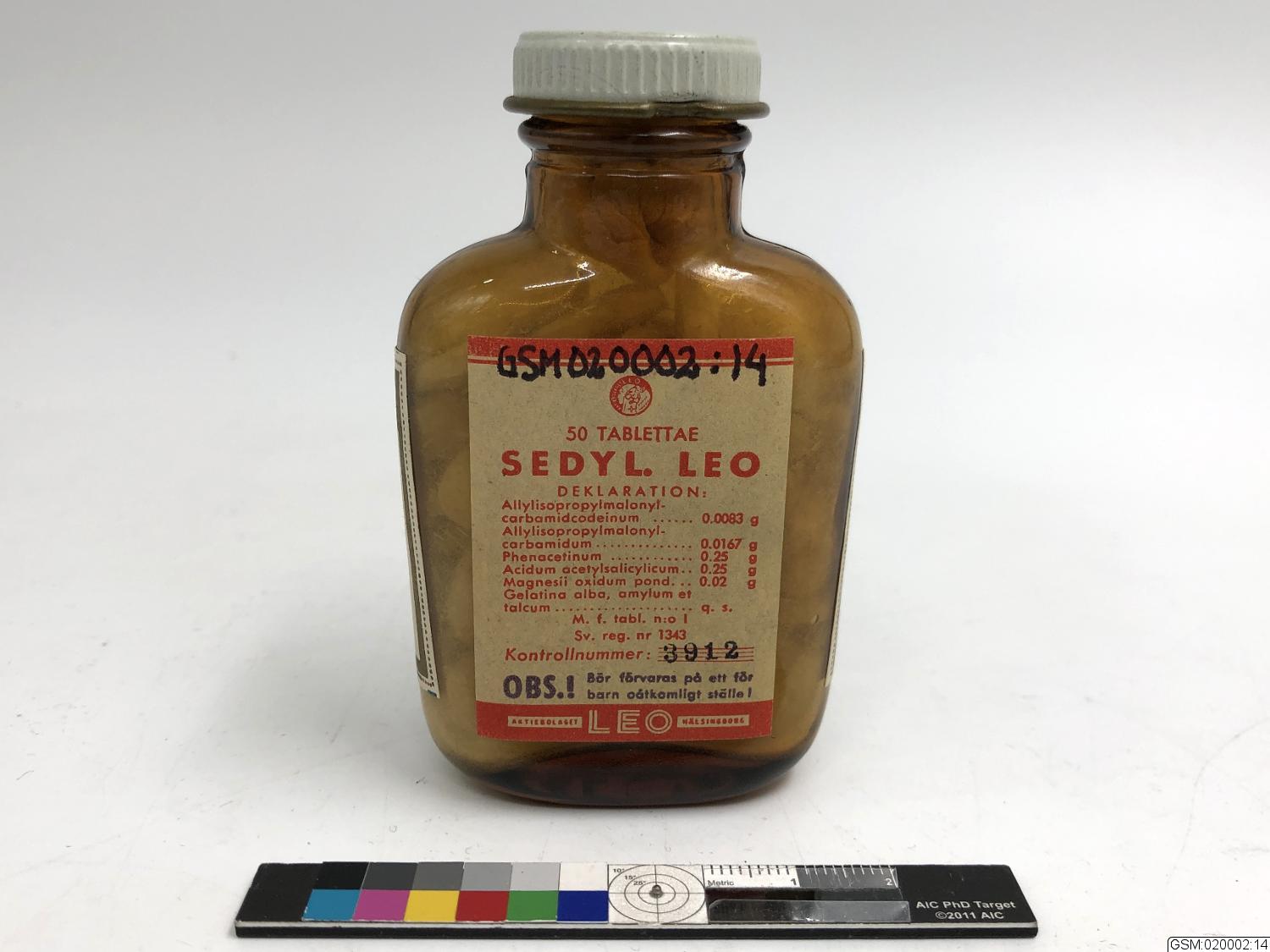 50 tablettae Sedyl. Leo Receptpåskrift: Apoteket Kronan, Göteborg, Kungsportsplatsen: Fil.mag Roland Hultén. 1 tablett på morgonen, 2 på kvällen mot smärtor. Ord. av dr Eckerström. Exp den 16-5-45. Ta...
