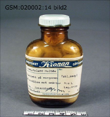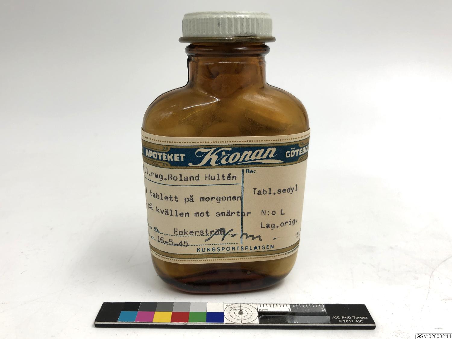 50 tablettae Sedyl. Leo Receptpåskrift: Apoteket Kronan, Göteborg, Kungsportsplatsen: Fil.mag Roland Hultén. 1 tablett på morgonen, 2 på kvällen mot smärtor. Ord. av dr Eckerström. Exp den 16-5-45. Tabl.sedyl N:o L. Lag.orig. 3.55