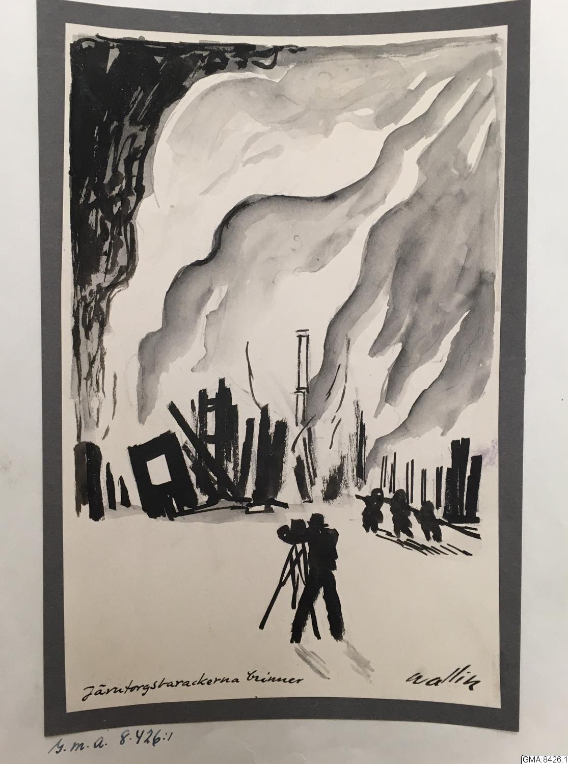 • Teckning 'Järntorgetstarackerna brinner' av Gunnar Wallin, 1947 (?)