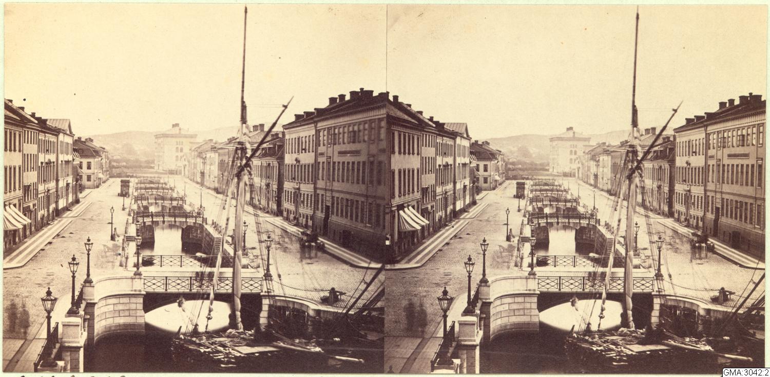 • Vy med Västra Hamnkanalen och Västra Hamngatan, blick mot söder. I fonden Allmänna och Sahlgrenska sjukhuset.