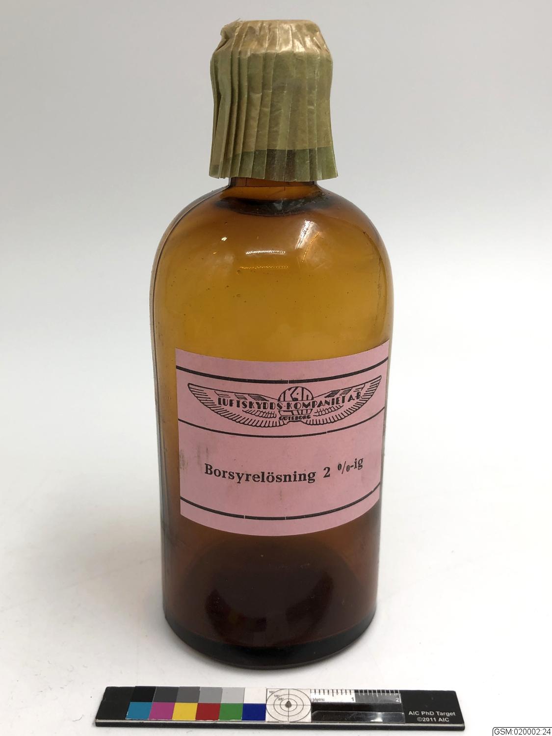 flaska som innehållit borsyrelösning; nu tom. Avsedd för baddning och spolning av ögonen vid gasskador. I instruktionslappen på förbandlådans lock anges "Obs rikligt" i instruktionerna.