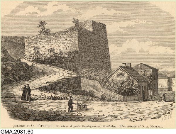 Bilder från Göteborg: Ett minne af gamla fästningsmuren, åt elfsidan. Efter naturen af O. A. Mankell. 1868.