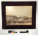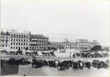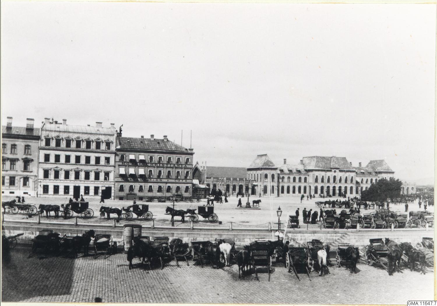 Vy över Drottningtorget, fotot taget från Slussplatsen, på båda sidor av Fattighusån. På Drottningtorget syns Hotel Christiania, Statens järnvägsstation och längst till höger syns en del av Göteborgs arbets- och fattigförsörjninganstalt, Bracka. På norra kajkanten finns till vänster en droskstation för häst, på den södra uppställda kärror och häst.