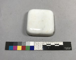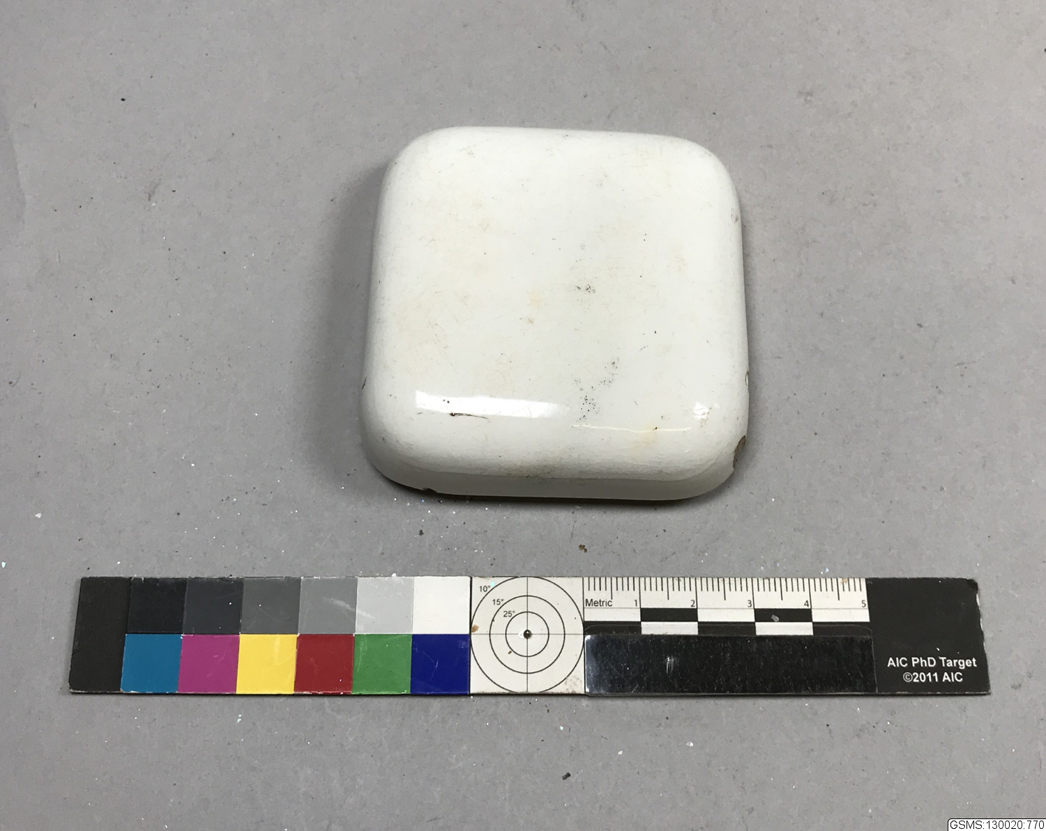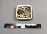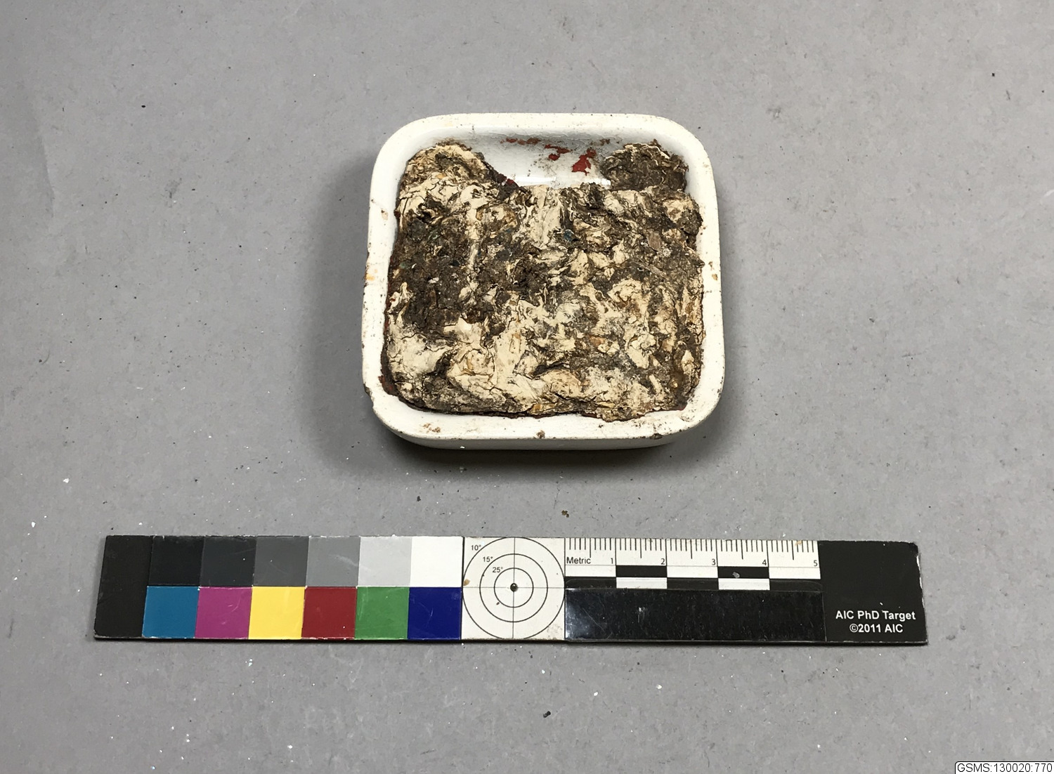 • porslinskopp, fyrkantig med rundade hörn. Fyllning, oklart vad. Pigmentrester