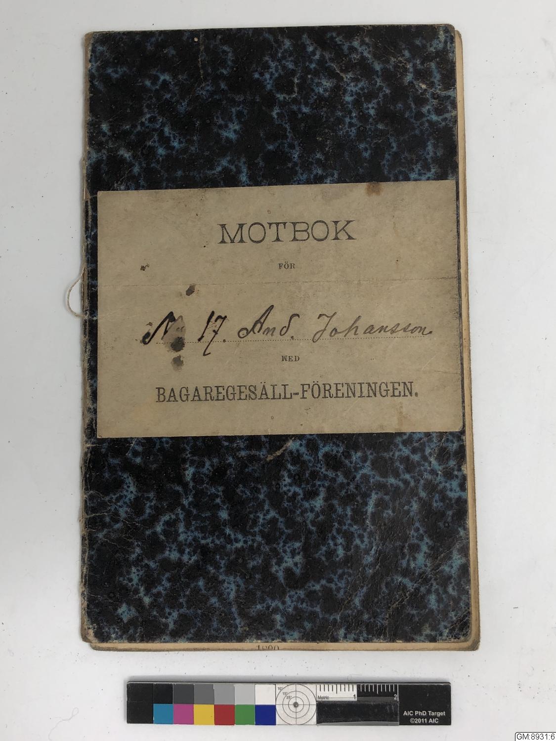 Låda av järnbläck, förfärdigad av Petter Pettersson för Bagaresällerna i Göteborg 1811. Sparbössa innehållande 5 st kopparmynt fr. 1800-talets första hälft samt Bagaregesällernas stadgar (31 st häften) samt en handskriven beskrivning över en räknemaskins utseende och bruk