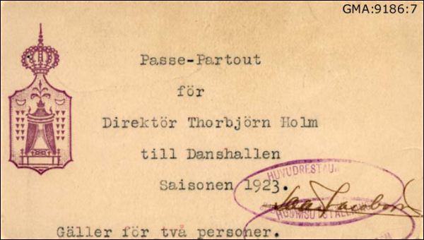 • Passe-Partout för direktör Thorbjörn Holm till Danshallen Saisonen 1923. Gäller för två personer. Stämplad med "Huvudrestaurangen. Jubileumsutställningen"