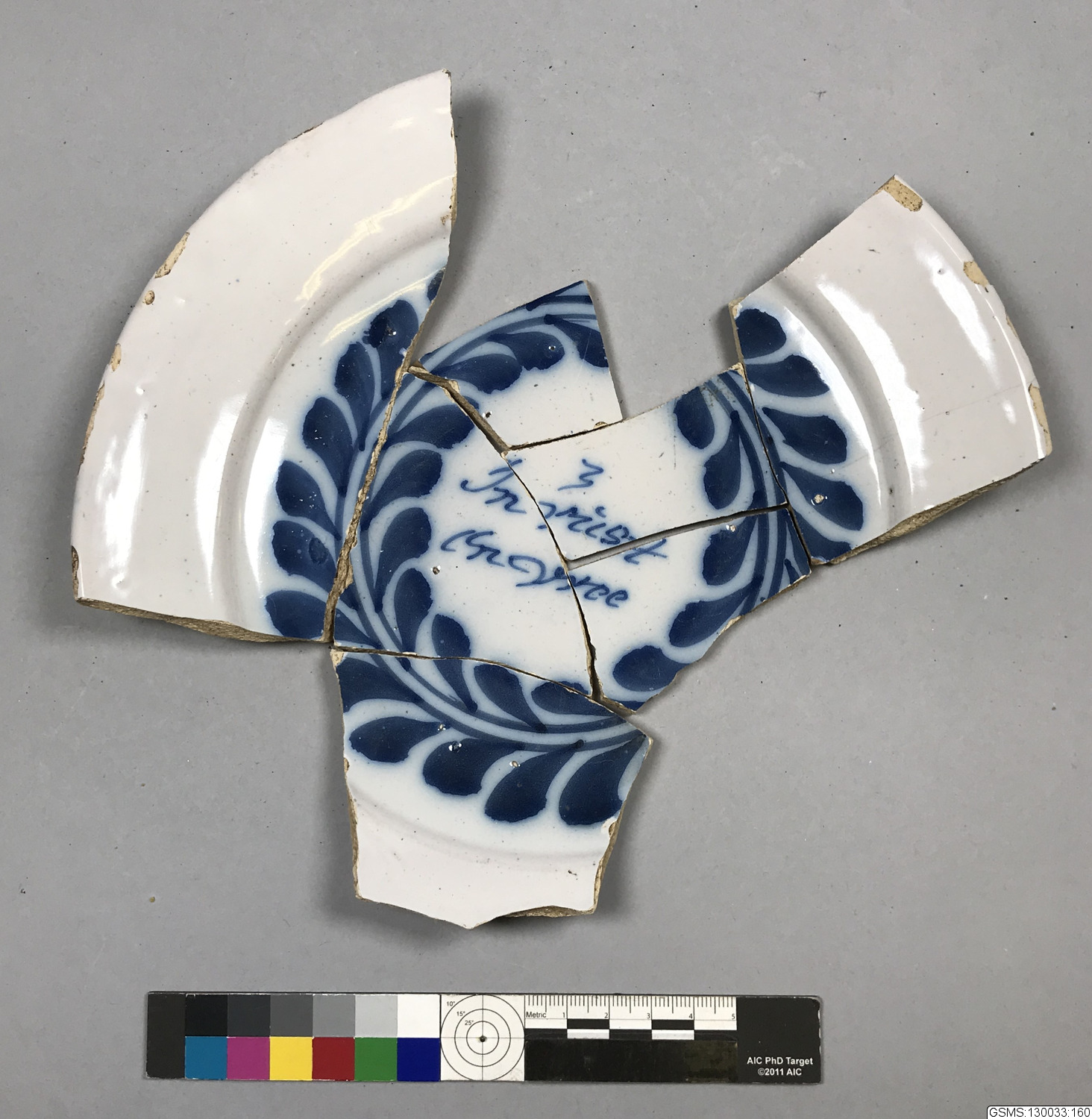 • skärvor av ett merrymanfat. En av skärvorna kan vara från annat fat