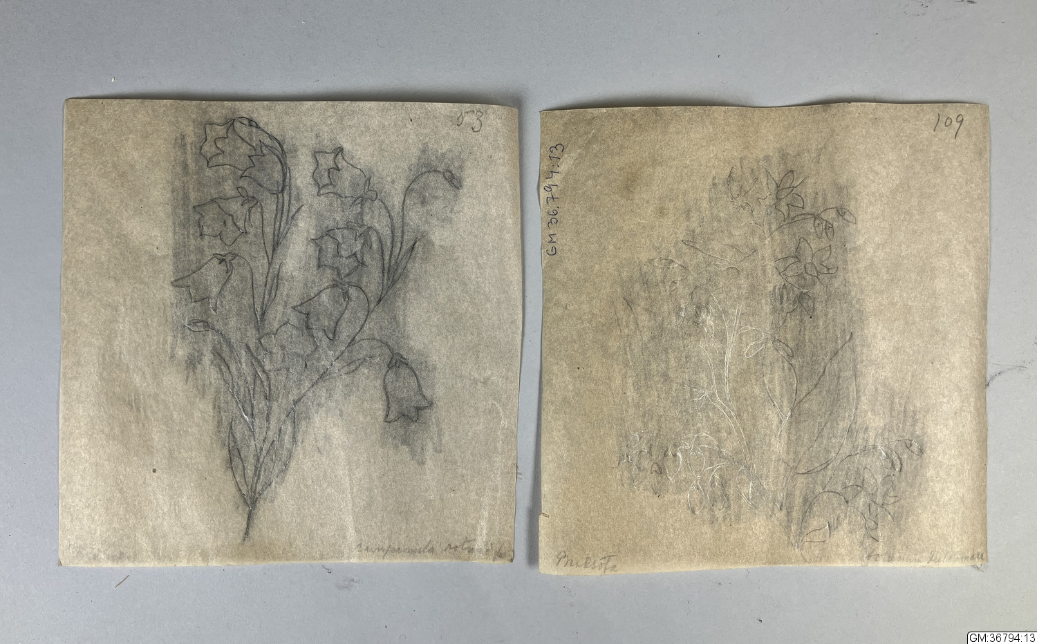 • Mönster på tunt smörpapper. Totalt 39 fyrkantiga ark med kalkerade blyertsteckningar av växter vilka förts över på porslinsytan som förlaga.