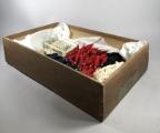 • Lådan är märkt på en kortsida "Silke". Innehåller garner av bomull och ull och ett träredskap - möjligen en s.k. "slingbräda".