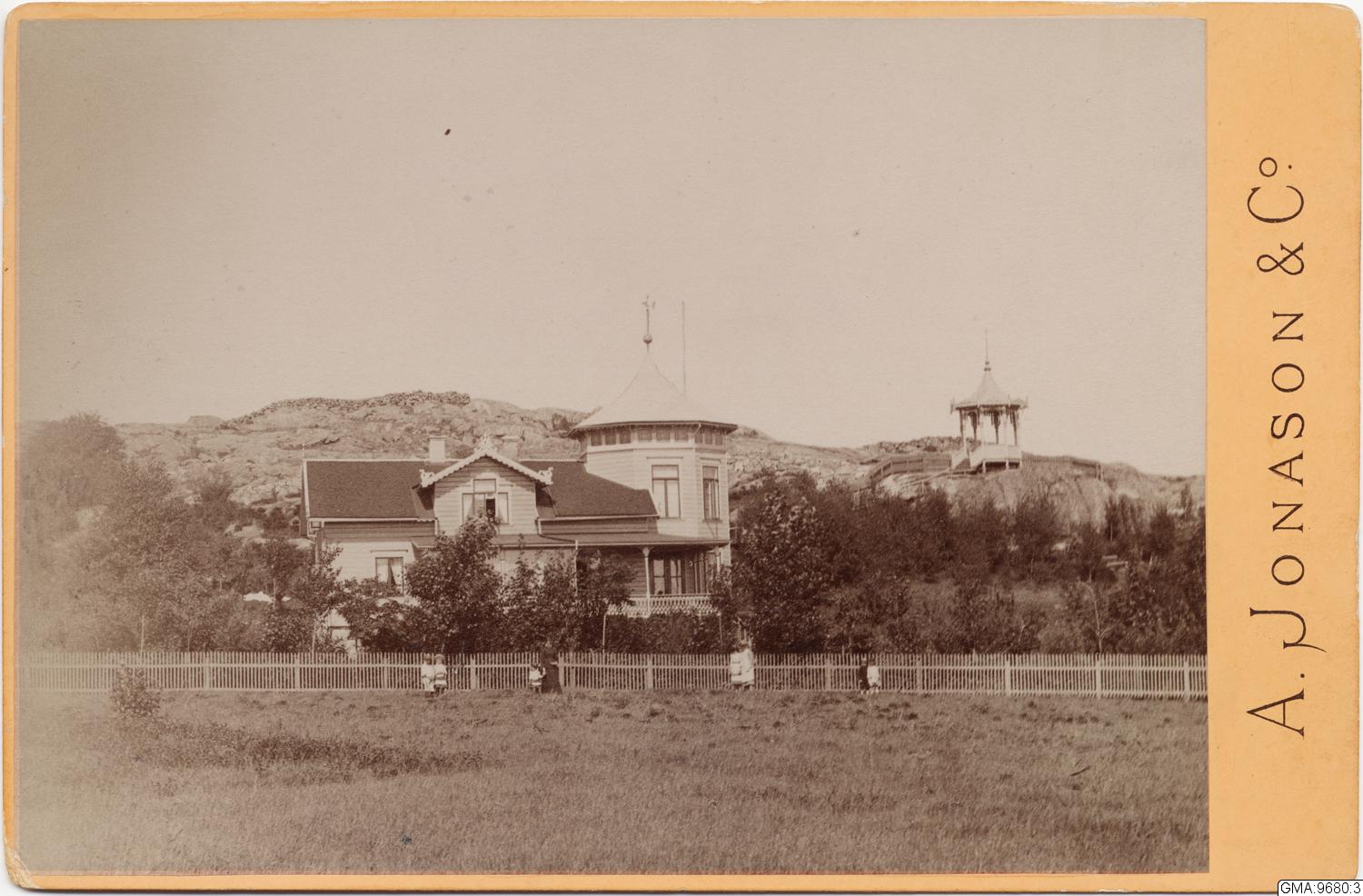 Per Emanuel Litanders villa i Arendal, som senare övertogs av Åkermarks. Framför staketet står fru Lithander med minsta barnet John, född 1879, på fotot 2-3 år. Fru Lithander har på fotot alla sina barn omkring sig, nämnda efter ålder; Edward, Maria (Mia), Gertrud, Ingeborg och John.
