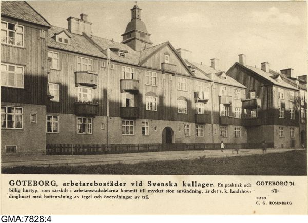Göteborg, arbetarebostäder vid Svenska kullager. En praktisk och billig hustyp, som särskilt i arbetarstadsdelarna kommit till mycket stor användning, är det s. k. landshövdinghuset med bottenvåning av tegel och övervåningar av trä. Göteborg 34 STF C. G. Rosenberg [tryck]