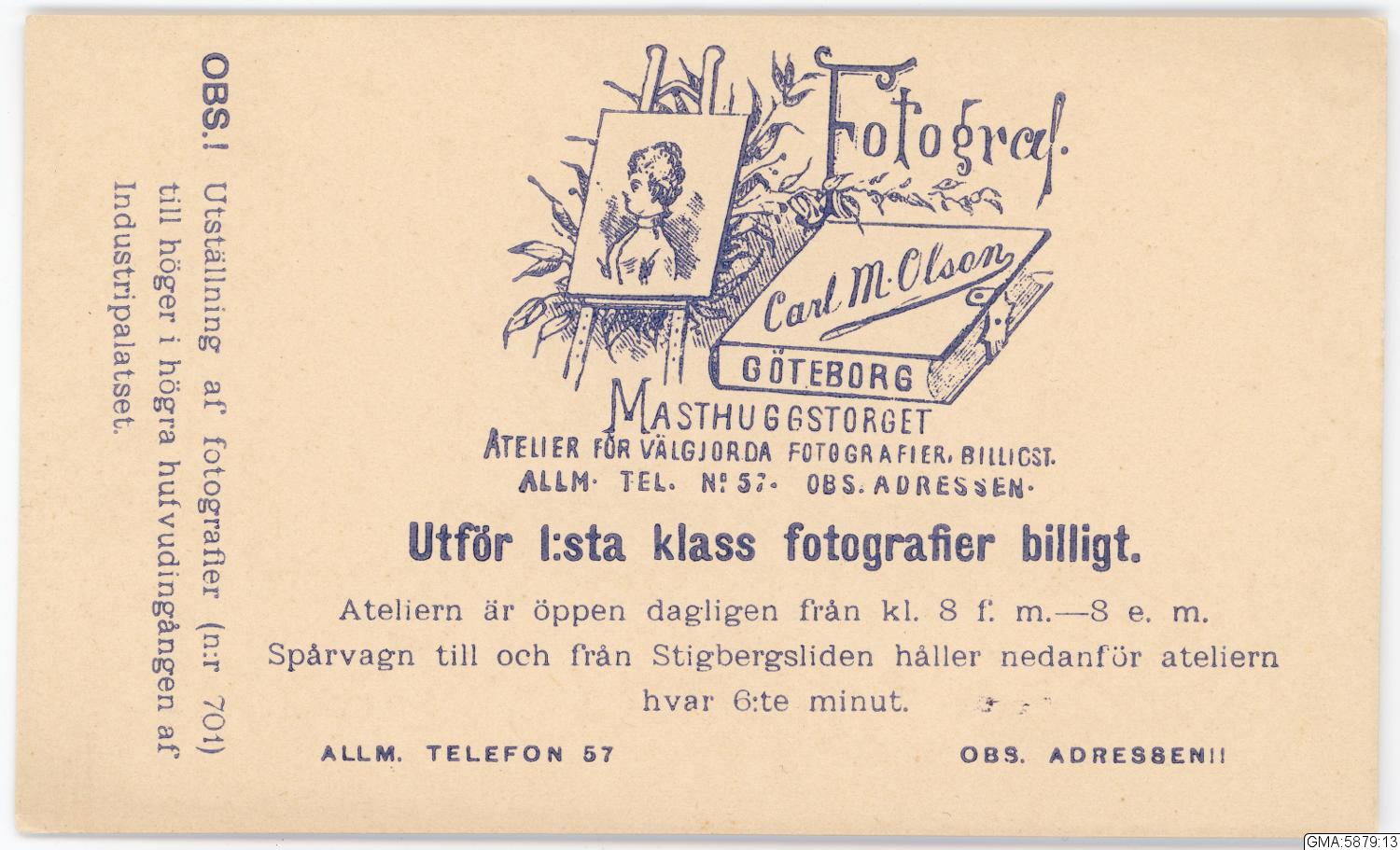 • Reklamtryck från Carl M Olson fotografifirma vid Industriutställningen i Göteborg 1891