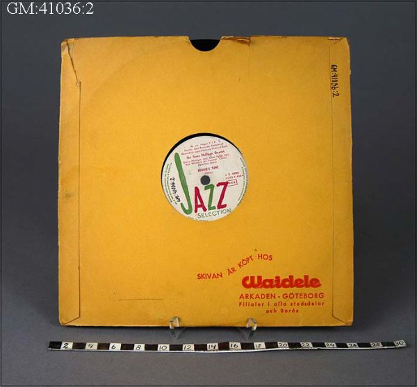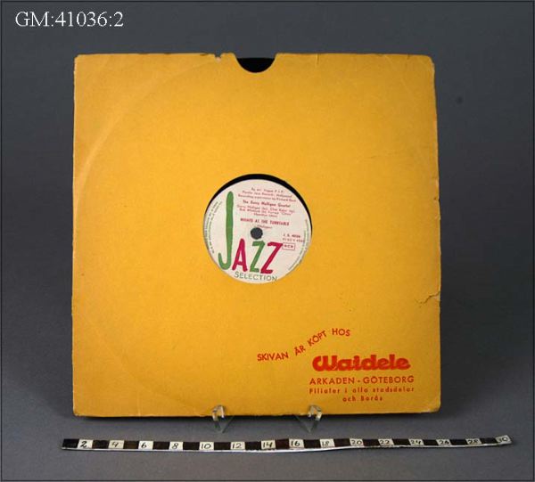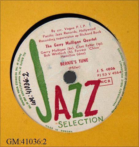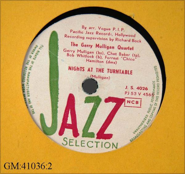 By arr. Vogue P.I.P. Pacific Jazz Records, Hollywood. Recording Supervision by Richard Bock. the Gerry Mulligan Quartette: Gerry Mulligan (bs), Chet Baker (tp), Bob Whitlock (b), Forrest "Chico" Hamilton (dms). Nights at the turntable (Mulligan). Jazz Selection [skivan; sid A]