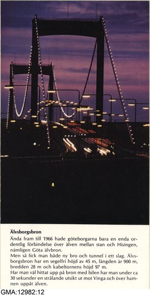 Älvsborgsbron Ända fram till 1966 hade göteborgarna bara en enda ordentlig förbindelse över älven mellan stan och Hisingen, nämligen Göta älvbron. Men så fick man både ny bro och tunnel i ett slag. ...